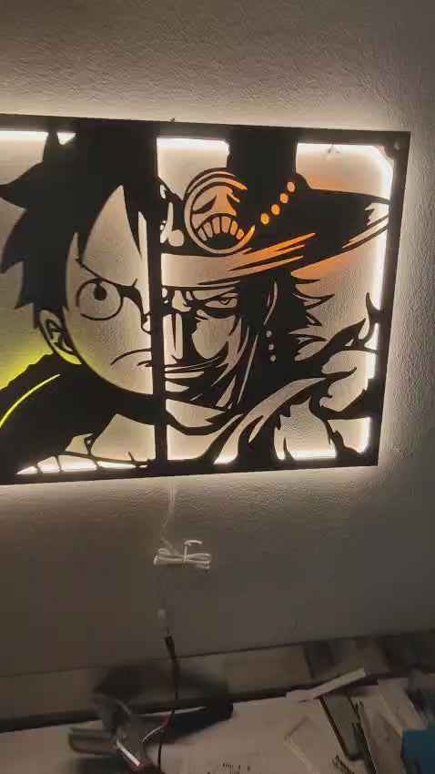 Luffy end Ace in MDF 6mm, dipinto a mano in tinta nera. Illuminato con neon led arancione, giallo e bianco caldo.